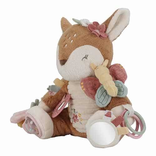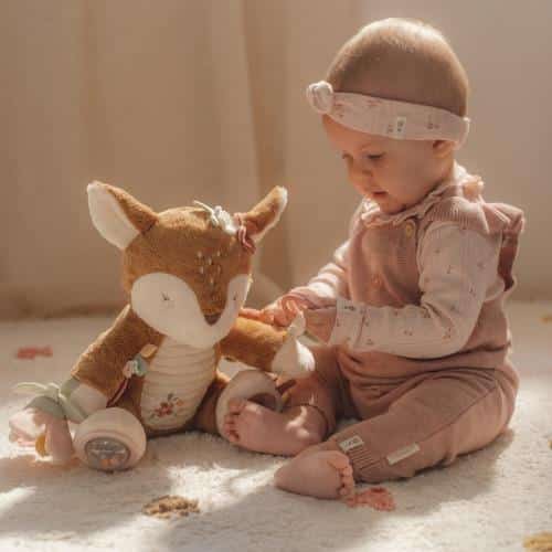 Faites des câlins et jouez ! Cet adorable cerf promet bien plus que des câlins. Découvrez toutes les activités intéressantes qu’il cache. Il y a un papillon qui se froisse sur son épaule, un cliquetis, des étiquettes et des fleurs à toucher et à sentir. Les anneaux autour de la jambe, le miroir sur un pied – autant de détails qui éveilleront la curiosité de votre enfant. Et après tout ce jeu, l’adorable cerf inspire les plus beaux rêves de jardin de fées.