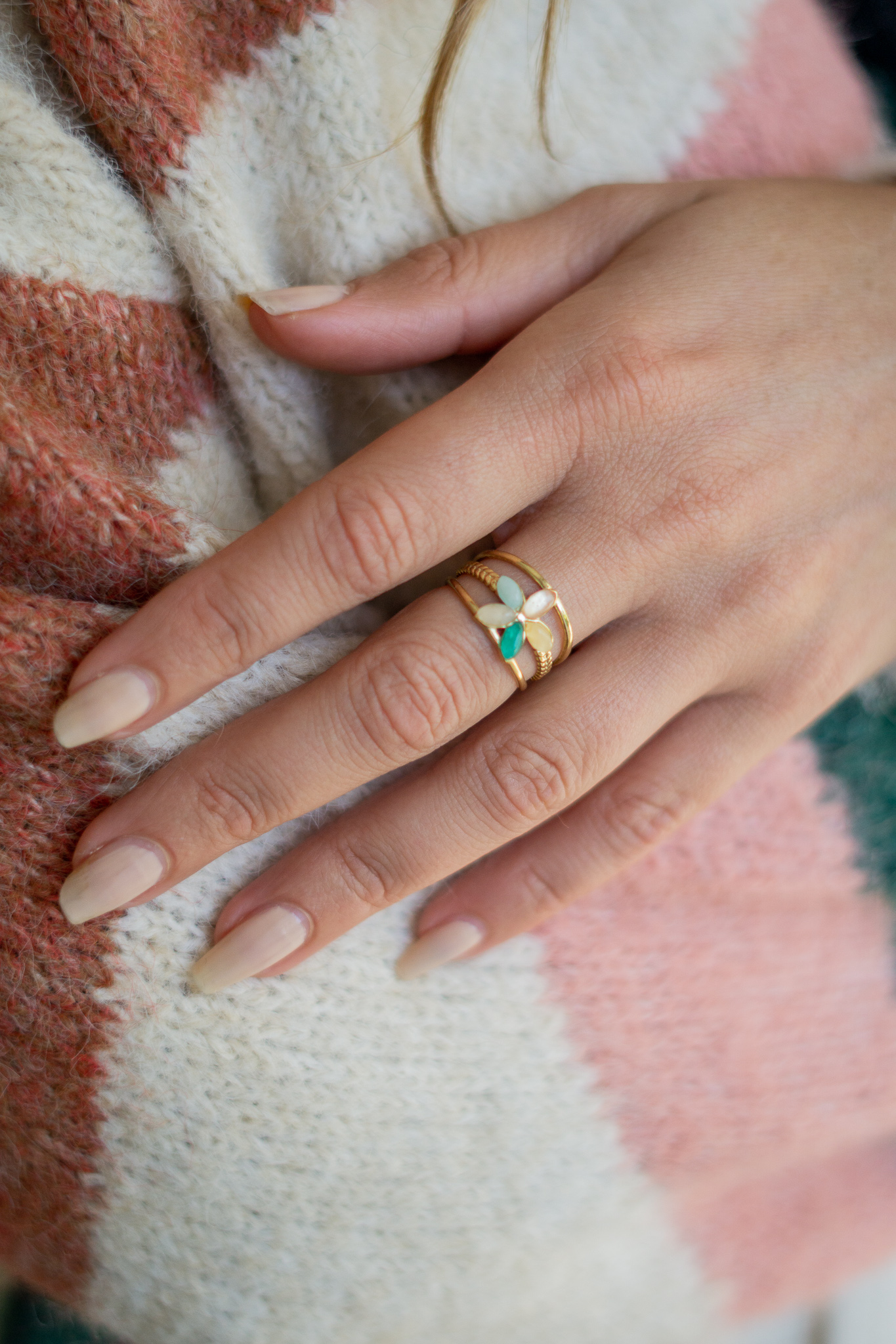 – Bague réglable, à 3 rangs et une fleur au milieu composée de 5 petites pierres naturelles