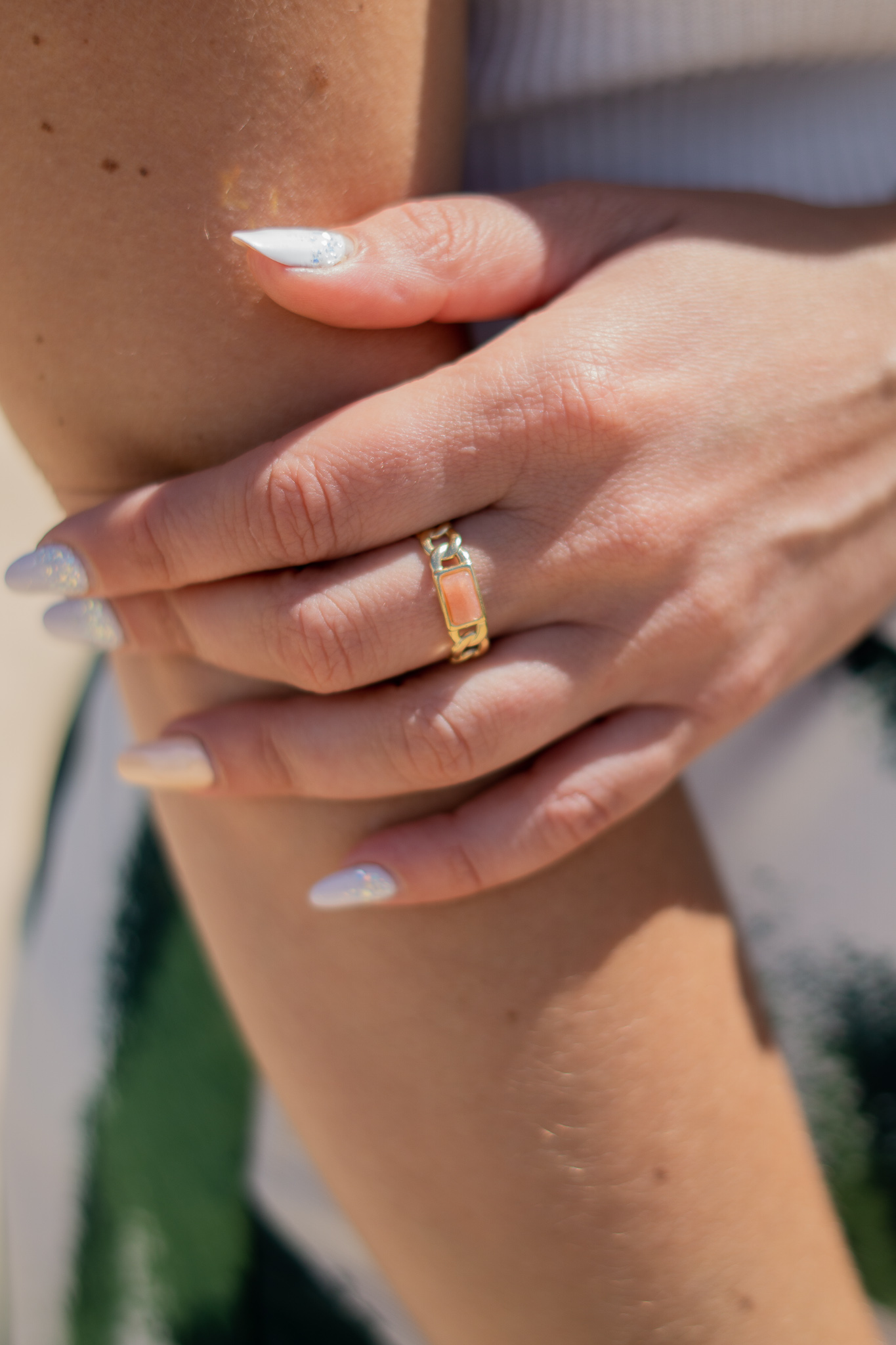 – Bague dorée, effet chaine avec pierre naturelle – Acier inoxydable 316l – Ne noircit pas, résiste à l’eau