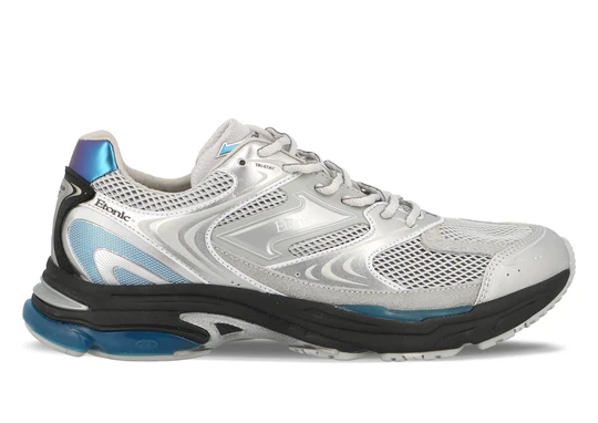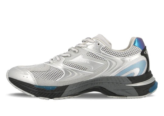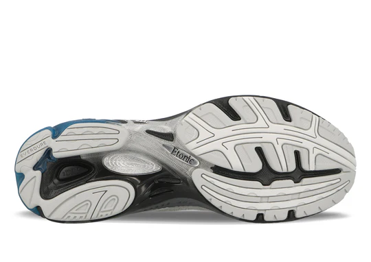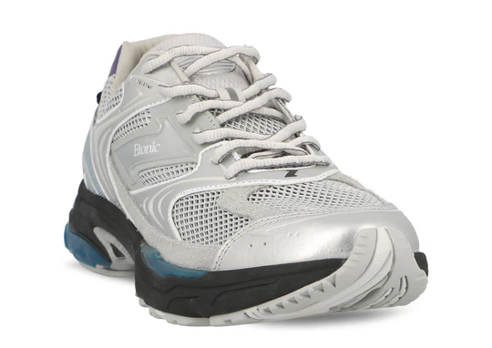 Cette version associe une maille argentée à des empiècements en éco-cuir argenté et gris, rehaussés de touches bleu glacier et de détails irisés au talon pour une esthétique élégante et futuriste. La semelle sculptée intègre des plaques DRP Plus visibles pour une meilleure absorption des chocs, tandis que le système de selle Z-Bar et le col rembourré assurent maintien et stabilité à chaque foulée.