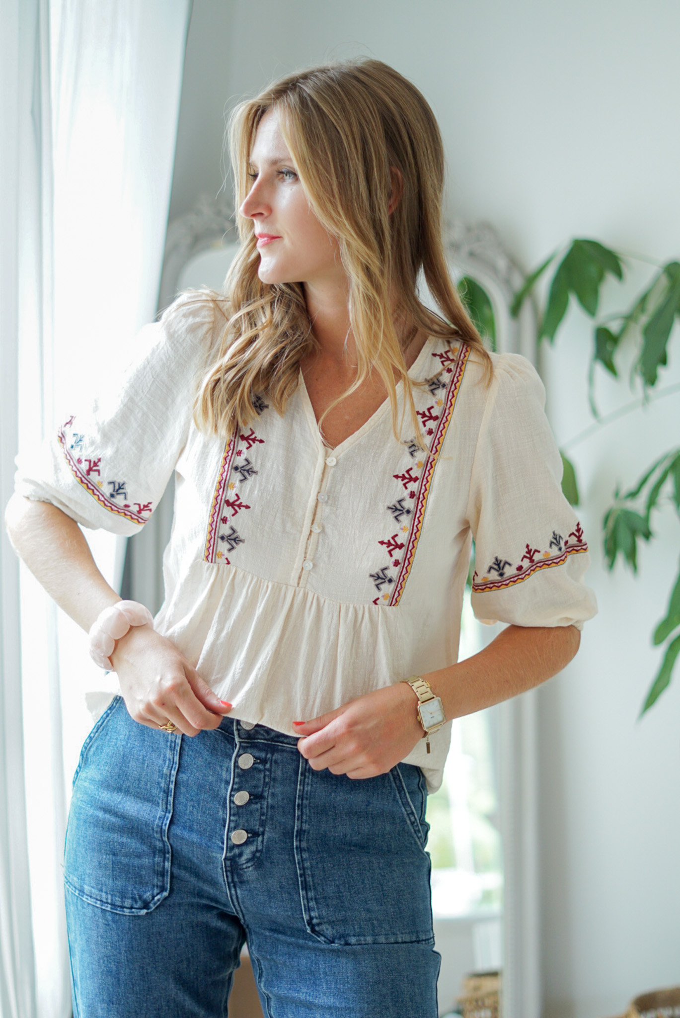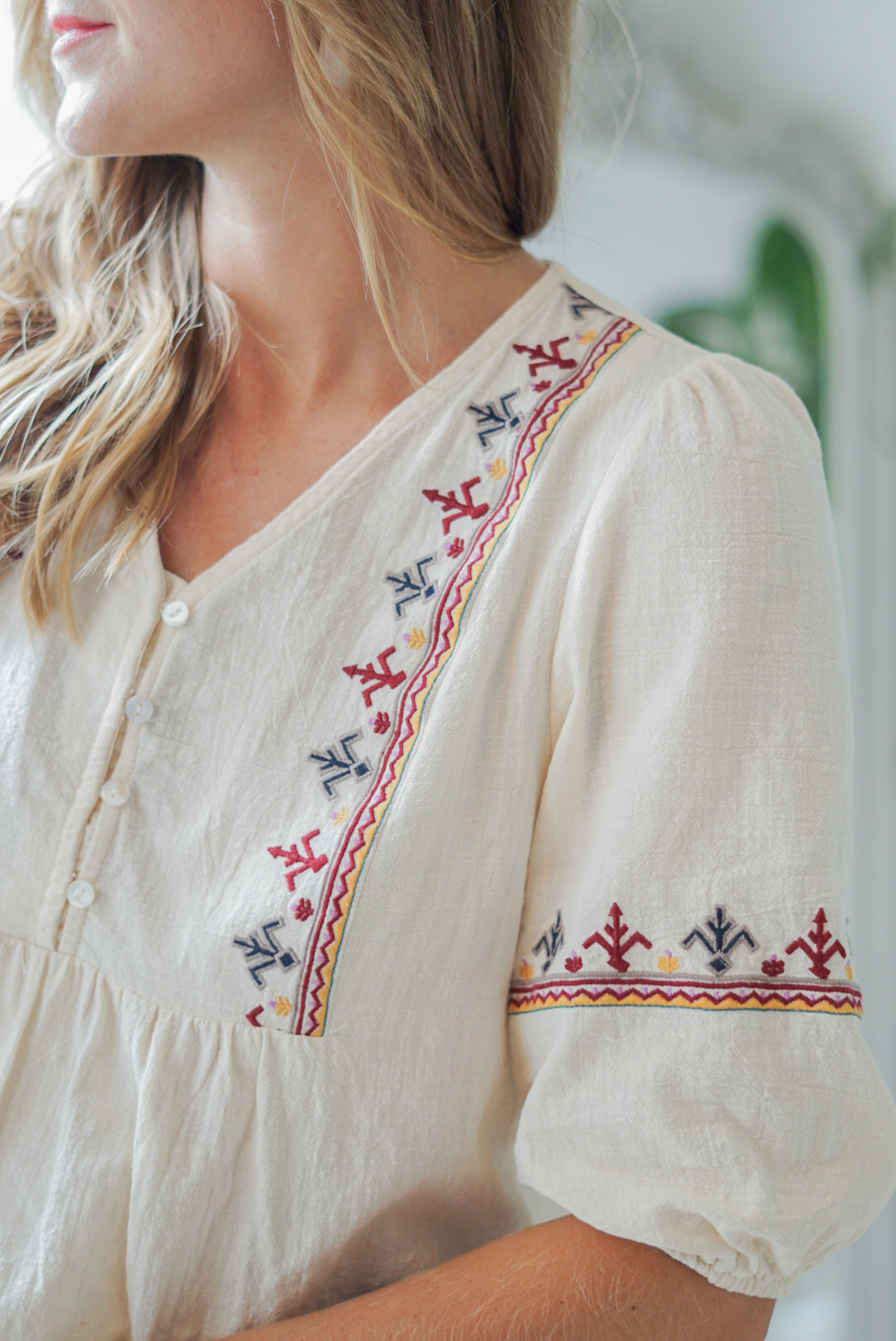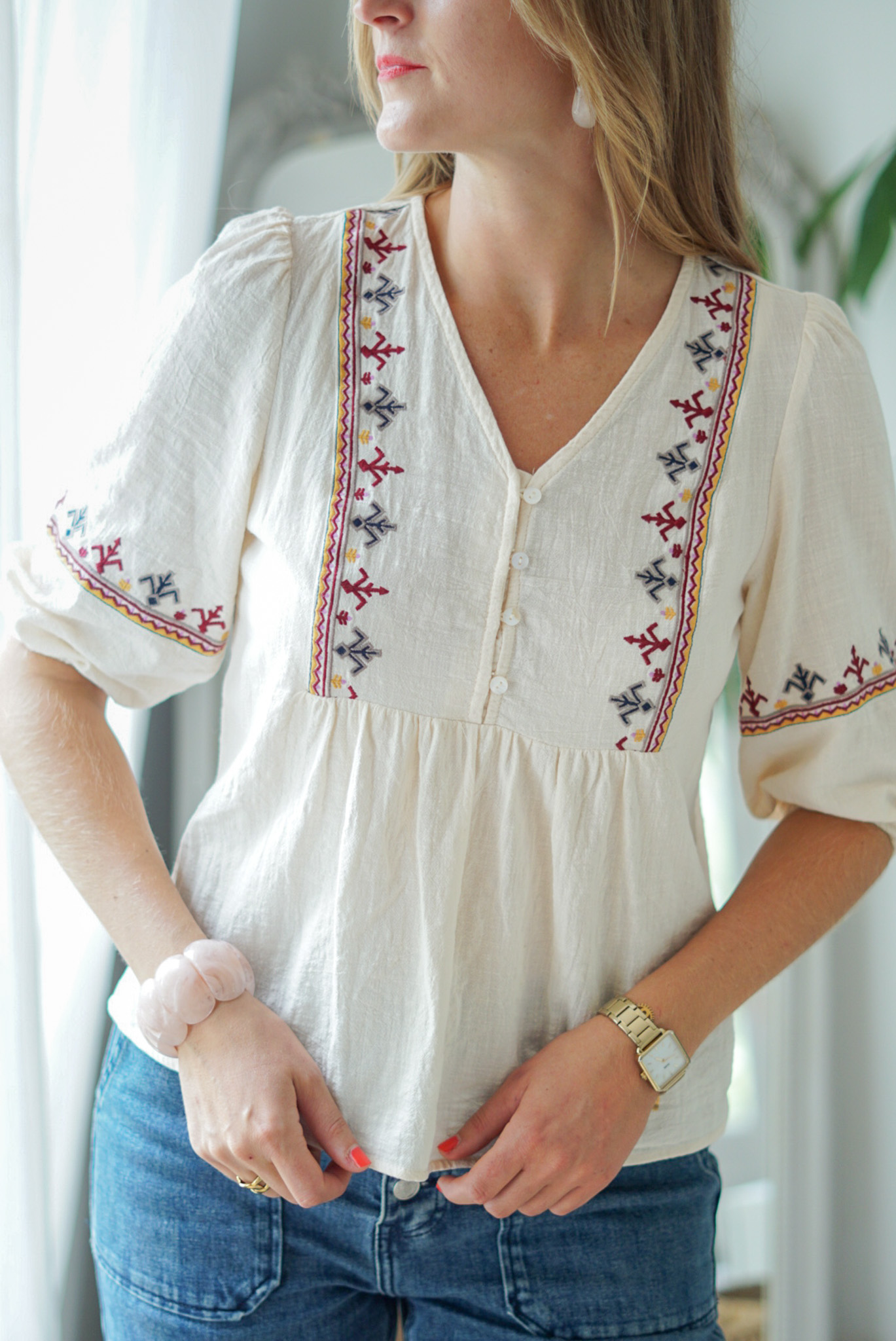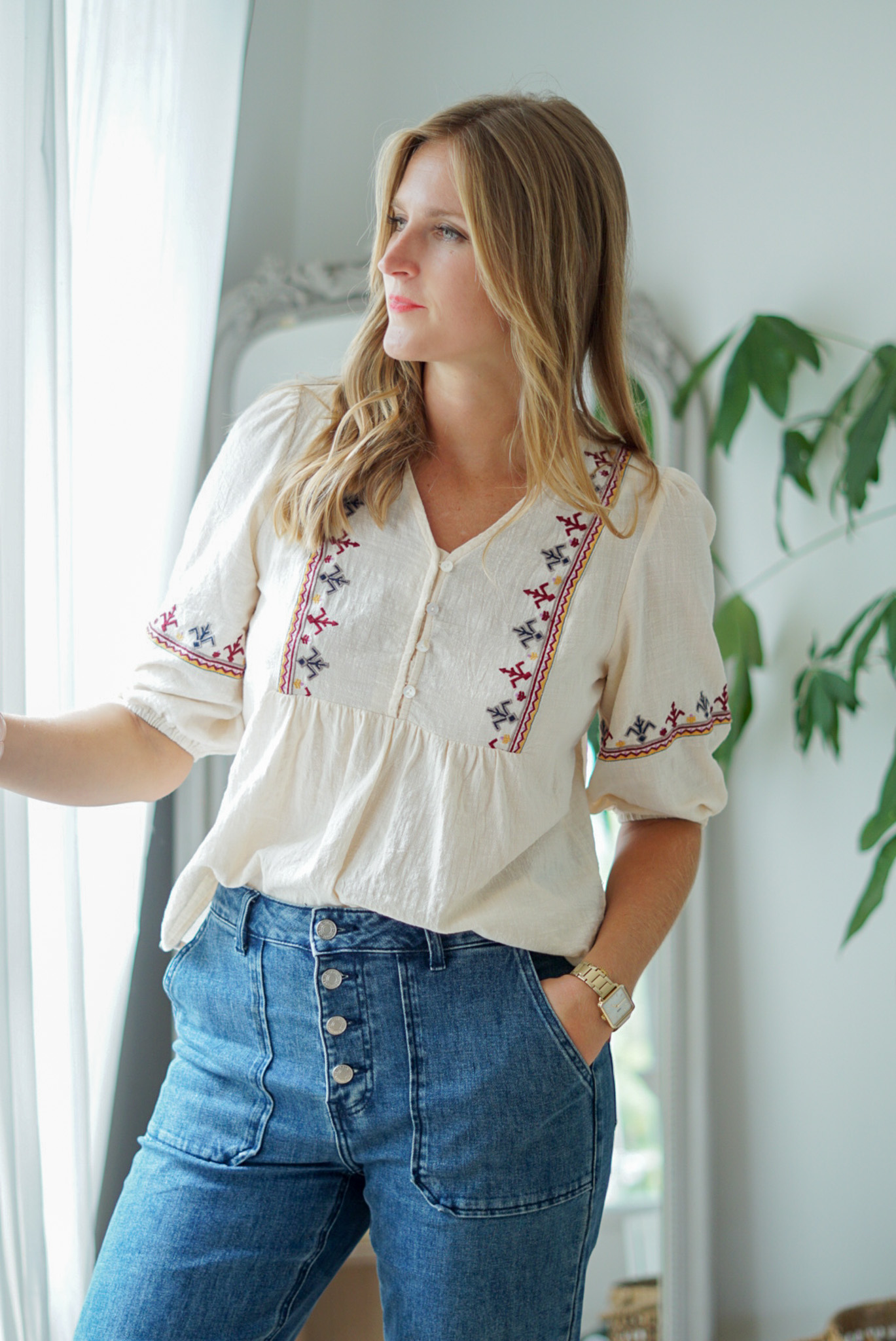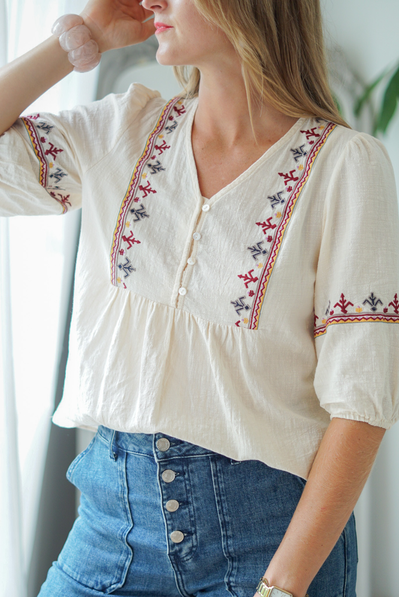 Avec ses détails brodés colorés et sa coupe fluide, cette blouse en coton écru apporte une touche bohème et féminine à vos looks !