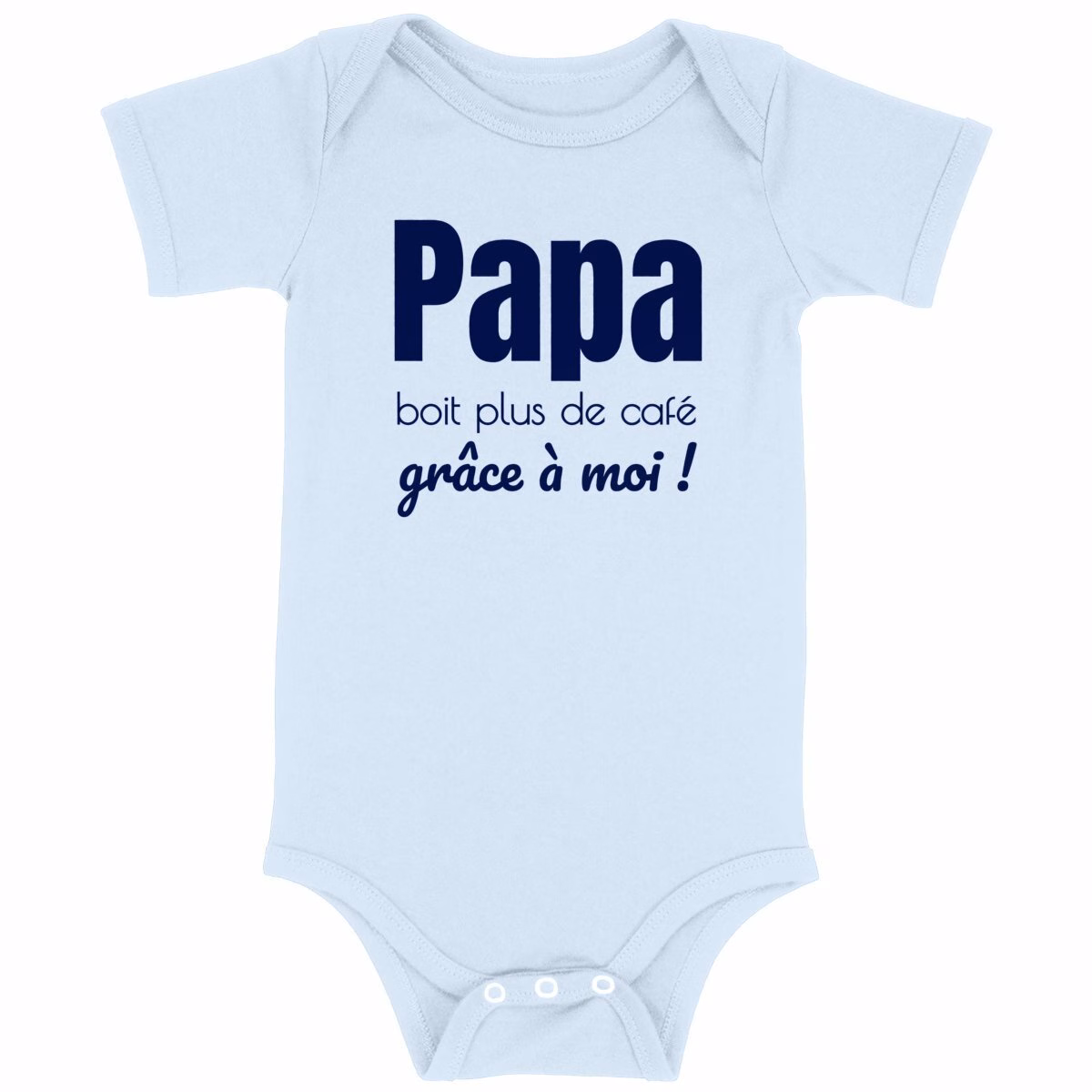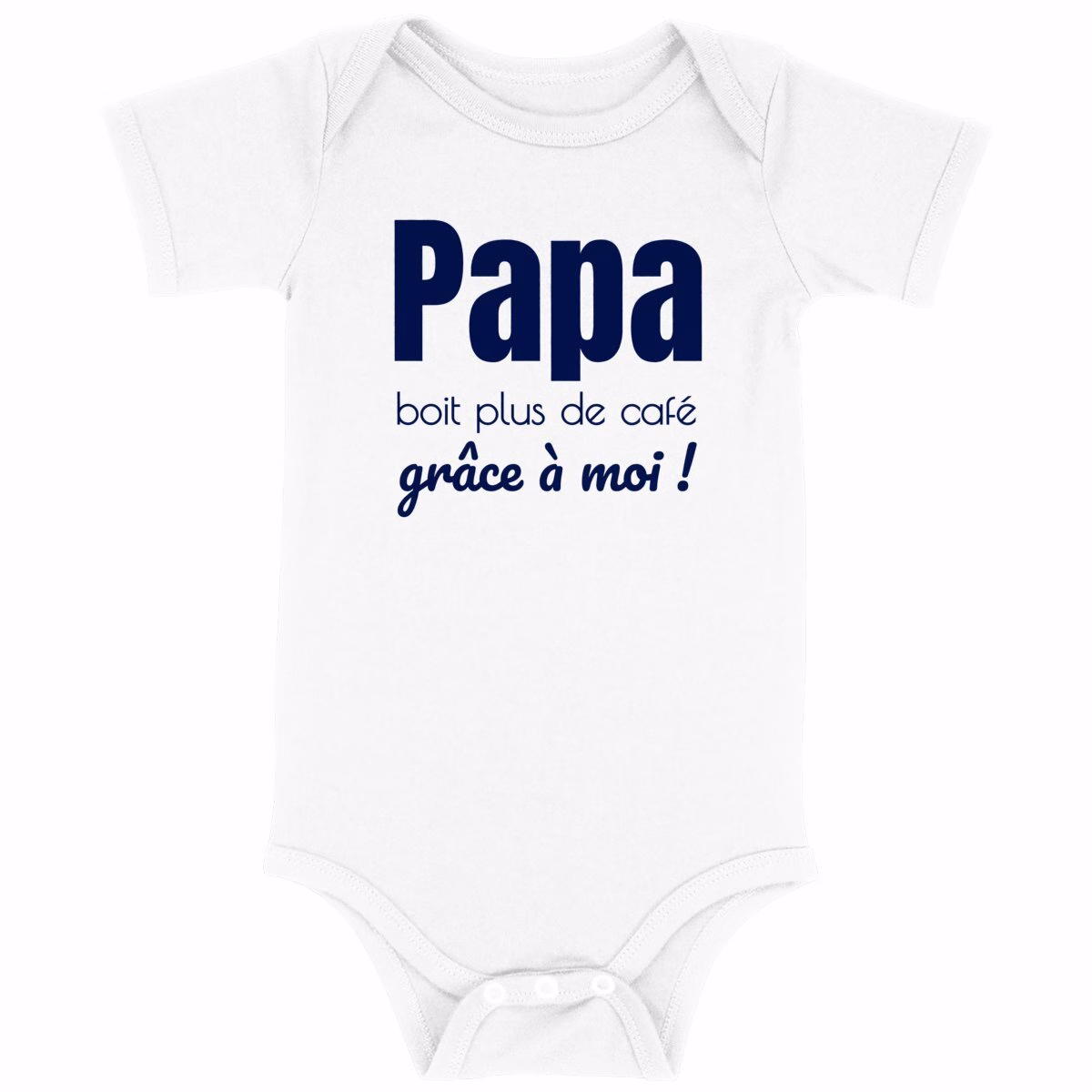 Le body coton bio pour bébé Papa boit plus de café grâce à moi ! est disponible du 0-3 mois au 12-18 mois, pour accompagner bébé de ses premiers jours jusqu’à ses premiers pas.