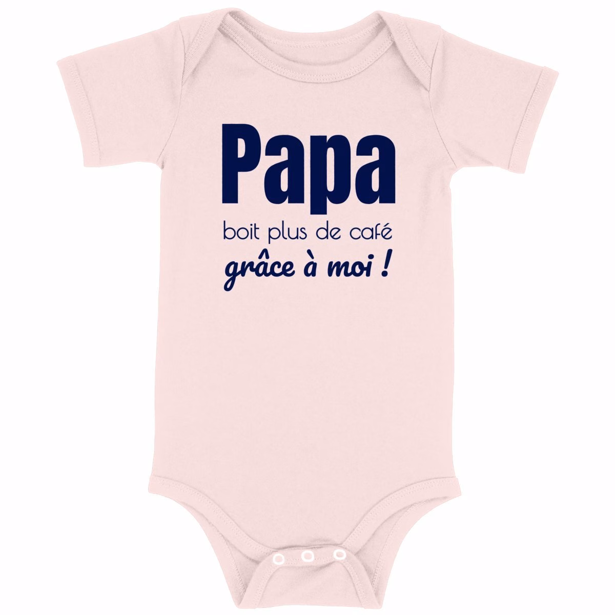 Body bébé en coton biologique certifié GOTS, ultra doux, 3 coloris (blanc, rose, bleu) avec slogan humoristique Papa boit plus de café grâce à moi, idéal en cadeau de naissance écoresponsable et pour une mode bébé durable.