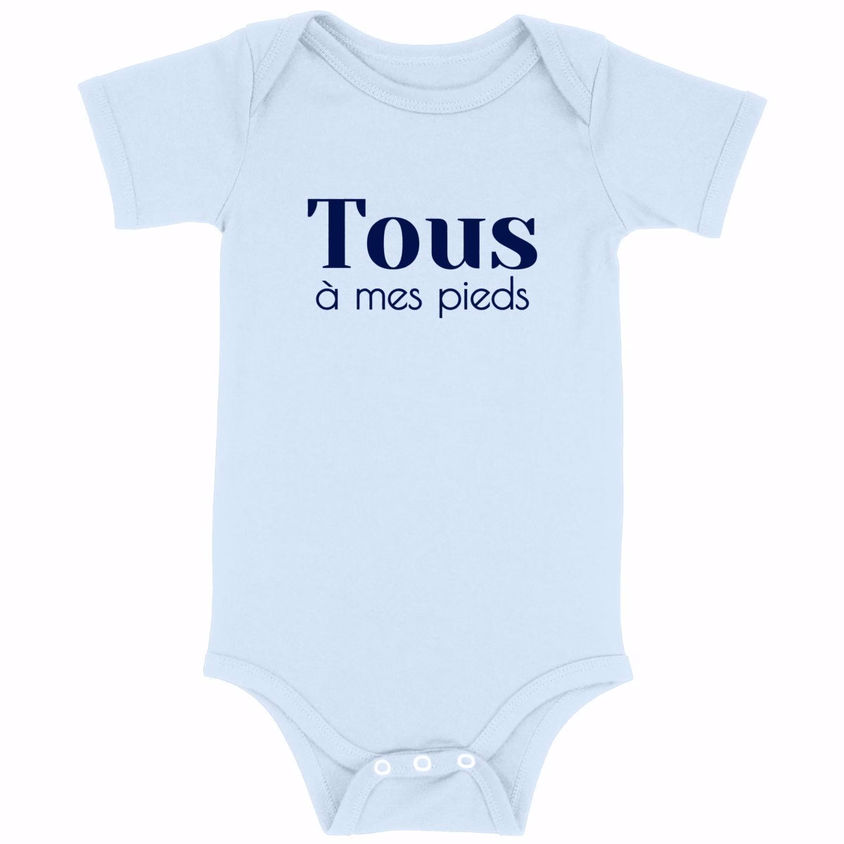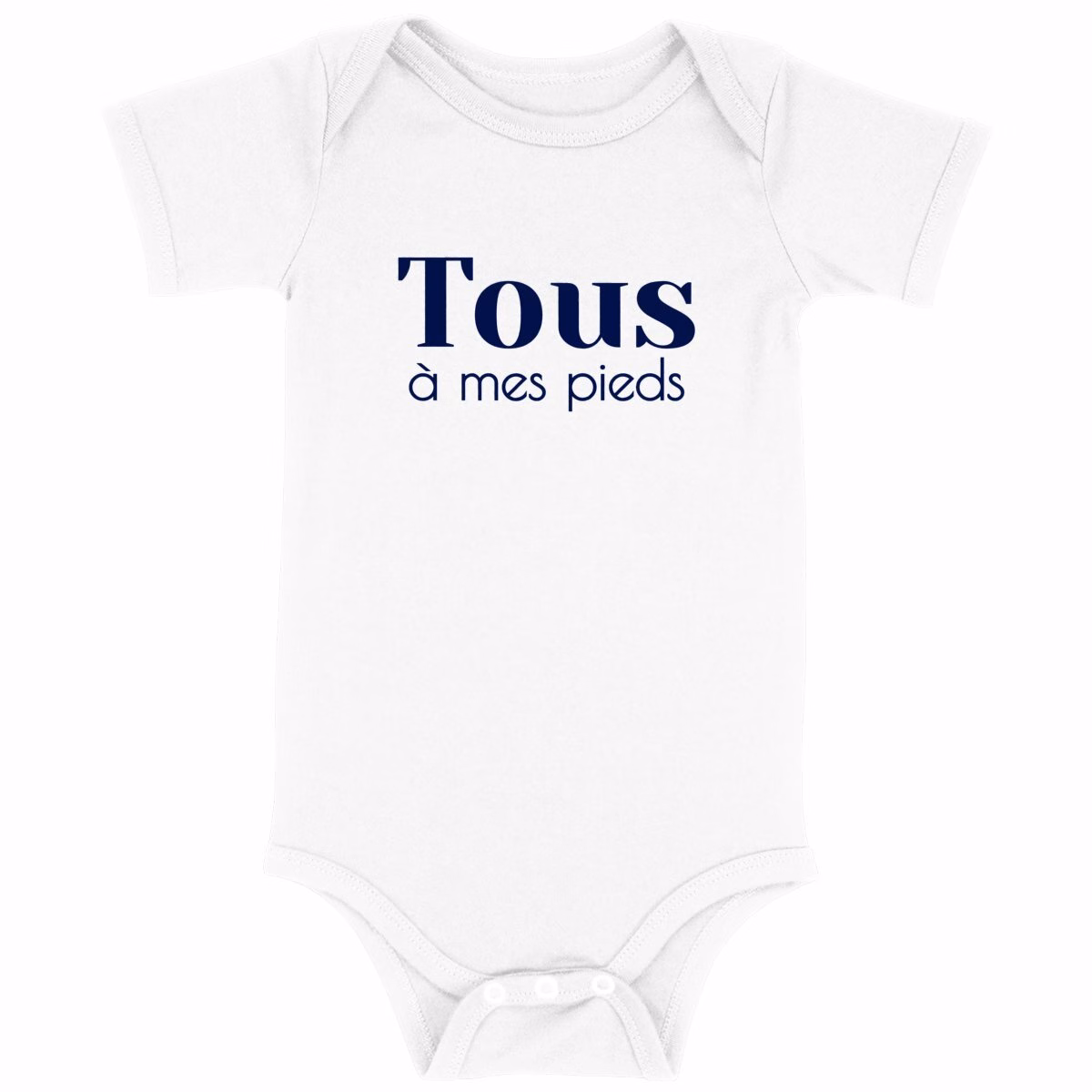 Body bébé en coton biologique certifié GOTS, slogan rigolo Tous à mes pieds, impression en France à la demande, coupe confortable et body écologique parfait pour un cadeau de naissance original.