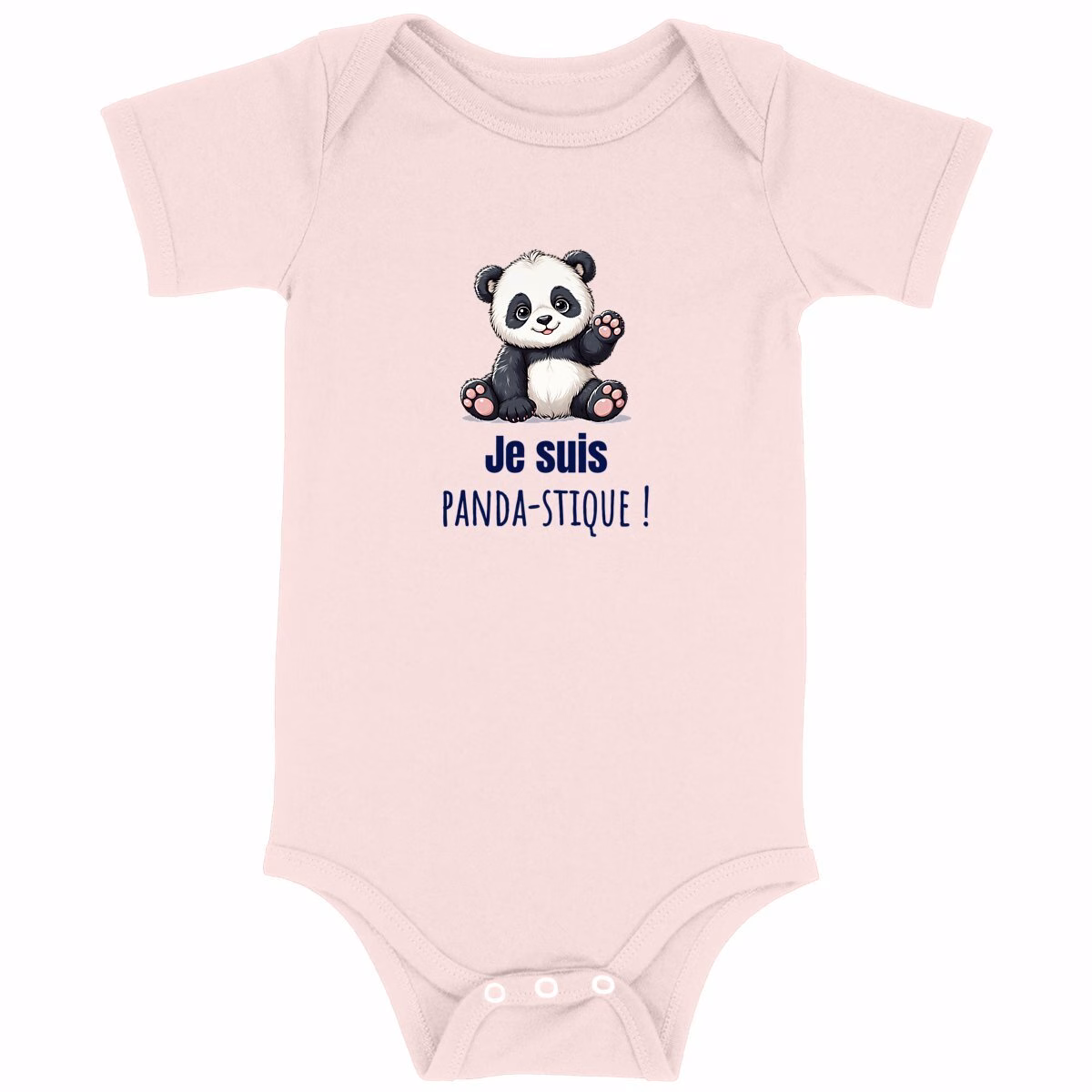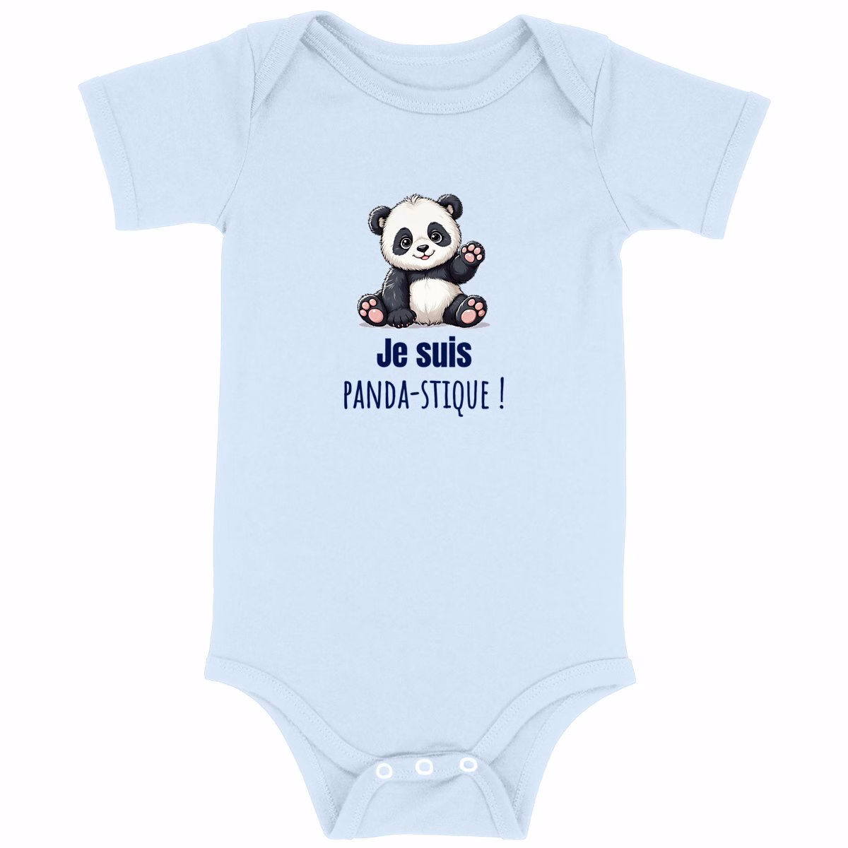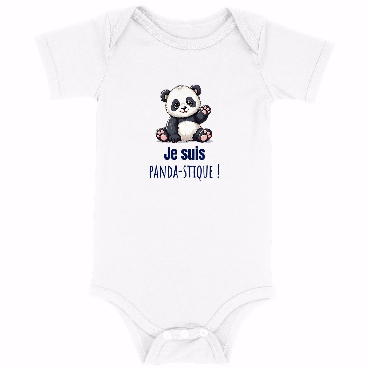 Body bébé en coton biologique avec panda mignon et slogan Je suis panda-stique, certifié GOTS, impression en France à la demande, confortable, éthique et écoresponsable pour la peau sensible de votre tout-petit.