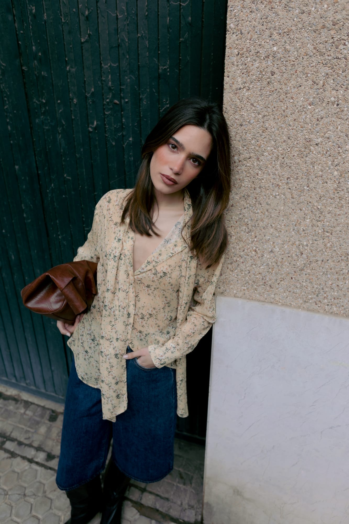 Chemise fluide femme fleurie Cette chemise fluide pour femme est une pièce incontournable qui allie élégance et modernité. cette blouse oversize se distingue par son col montant agrémenté d’un petit foulard amovible à nouer, offrant polyvalence et touche raffinée !
