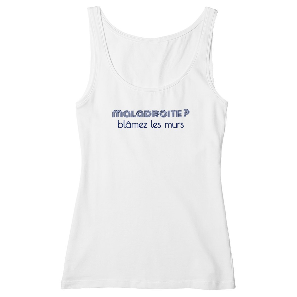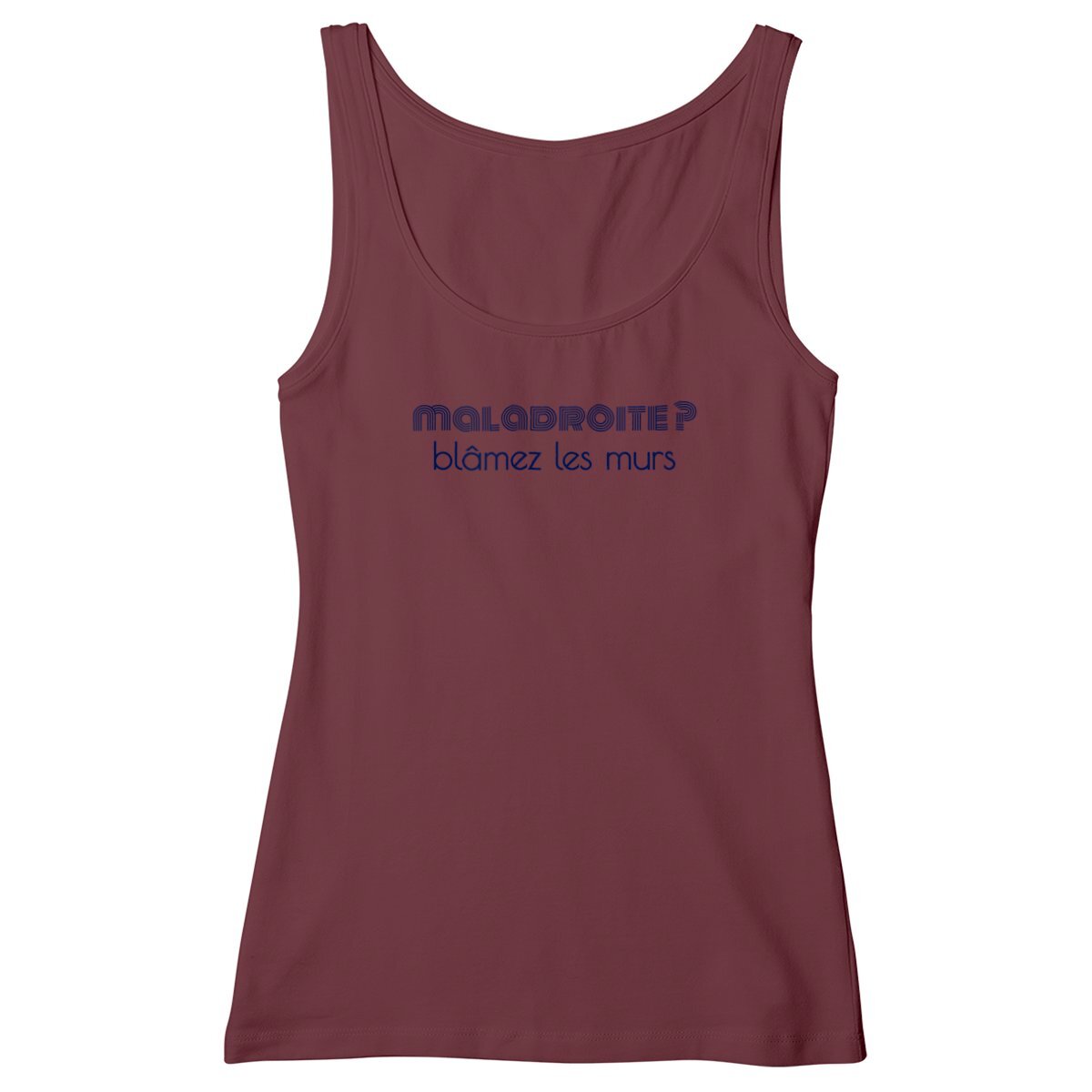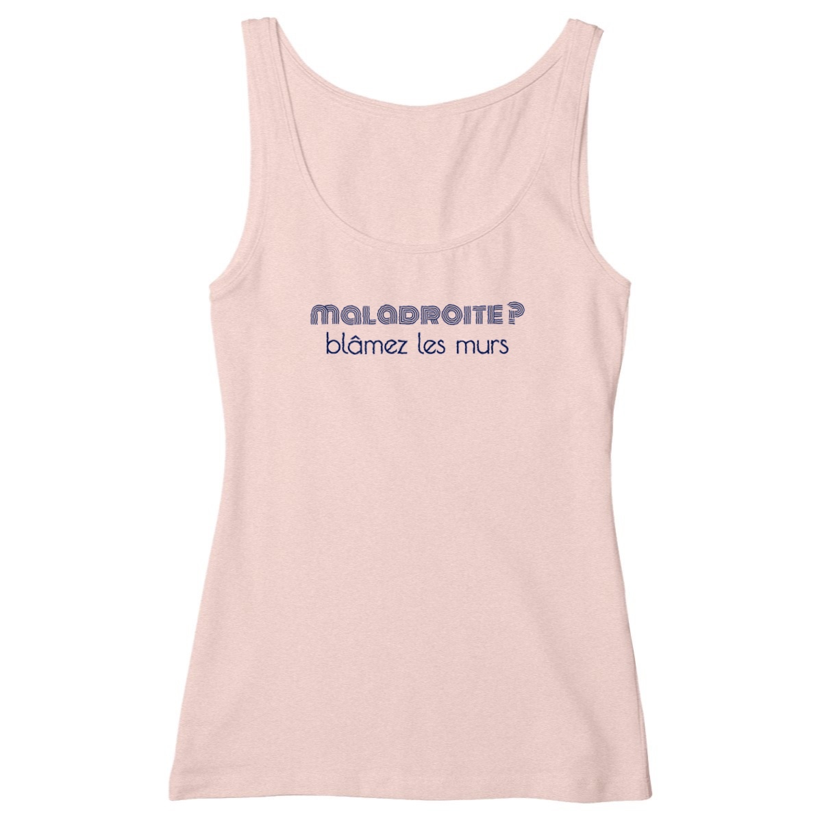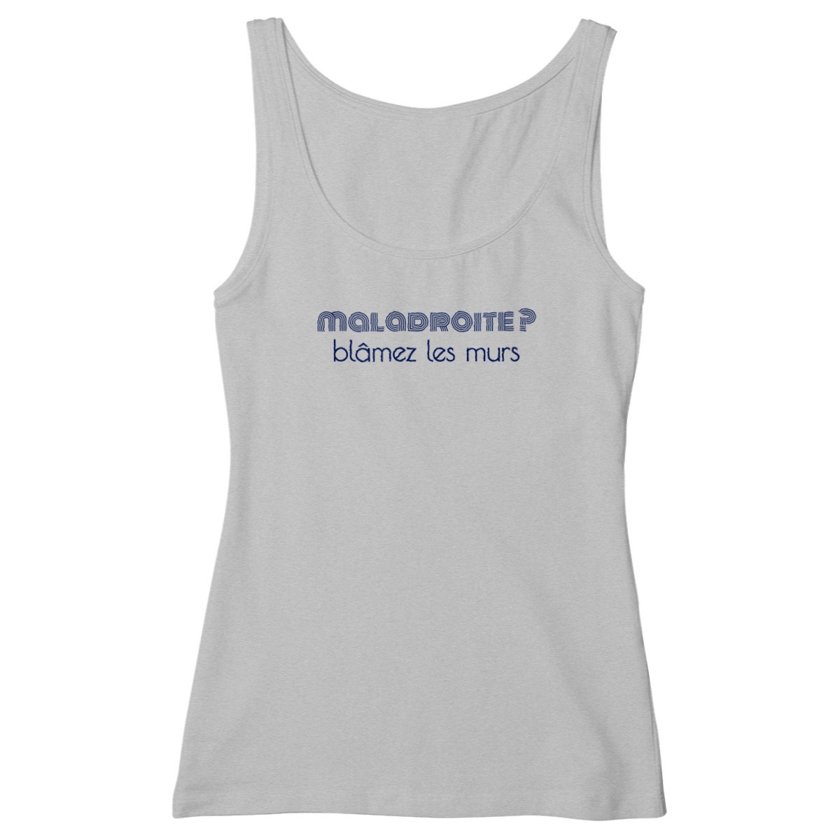 Affirmez votre humour avec ce débardeur bio femme cintré maladroite ? blâmez les murs, en 100% coton biologique, coupe ajustée, tissu léger 120 g/m² et fabrication éthique certifiée pour un style fun et écoresponsable.
