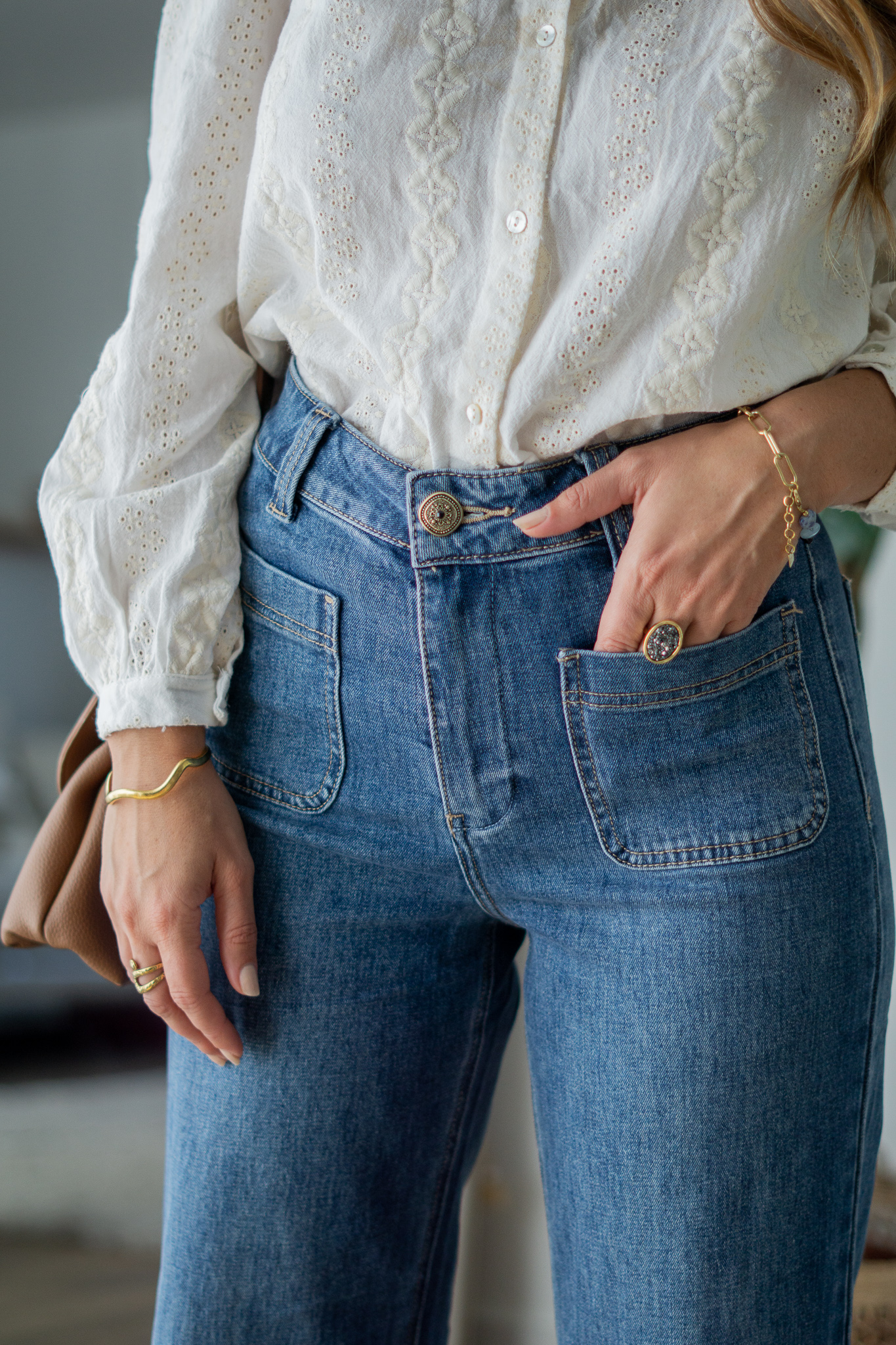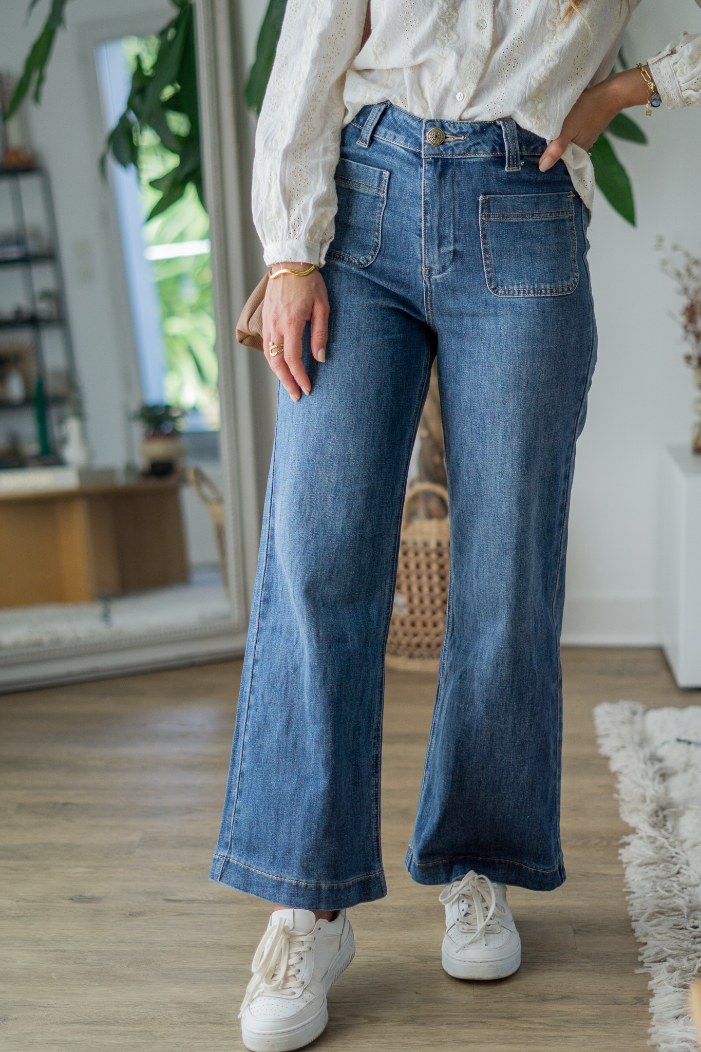 – Jean coupe wide court – Bouton bijou – Taille haute – Passants pour ceinture – 4 poches – Fermeture par bouton et zip COMPOSITION : 99% coton, 1% elasthanne ENTRETIEN: Lavage en machine à 30°C, pas de sèche linge.