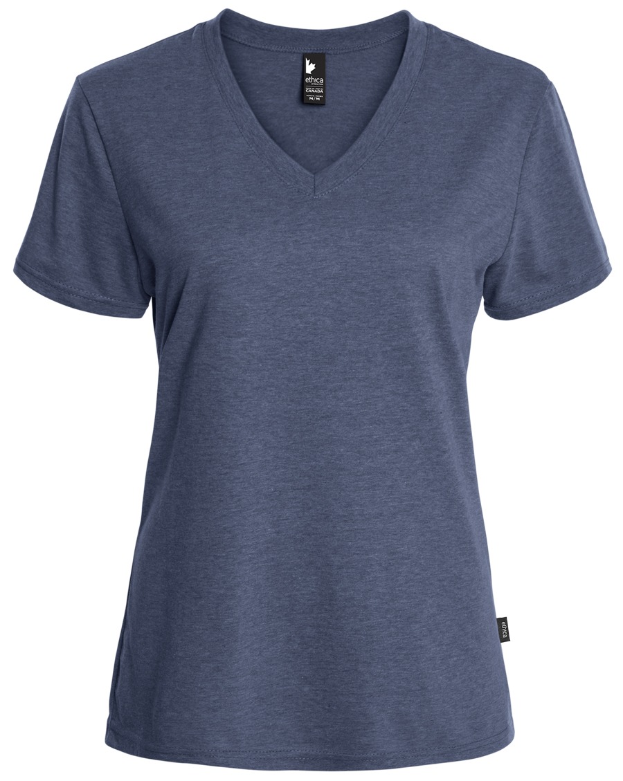 Composition Couleurs chinées : jersey fin – 50 % coton biologique / 50 % polyester recyclé Couleurs unies : jersey fin – 100 % coton biologique ● Un t-shirt à encolure en V pour un style des plus décontractés ! ● Ajouter ce basique écoresponsable à votre collection pour une garde-robe variée. ● Plusieurs couleurs vous sont offertes. ● Fabrication canadienne syndiquée. Charte de tailles