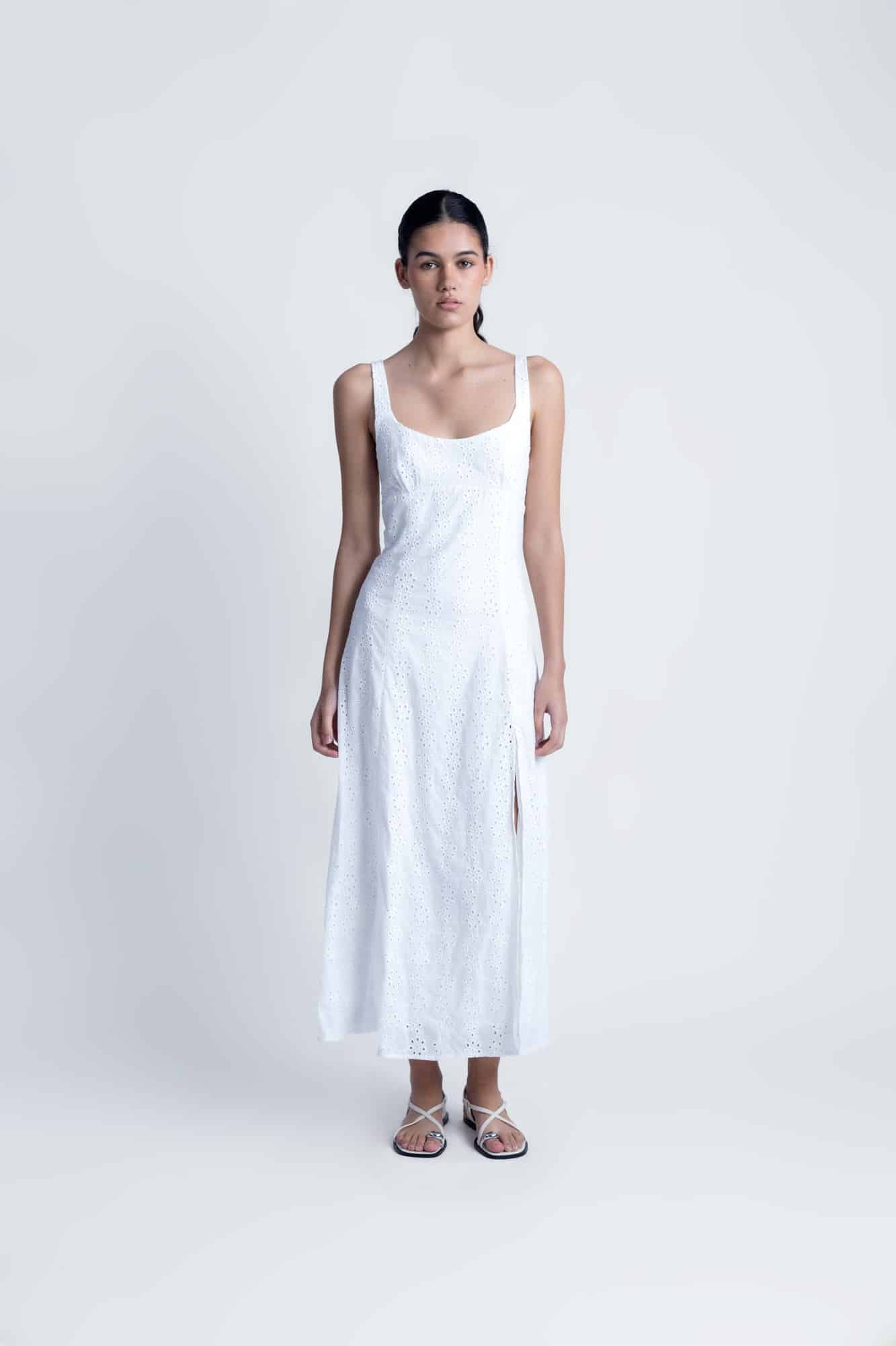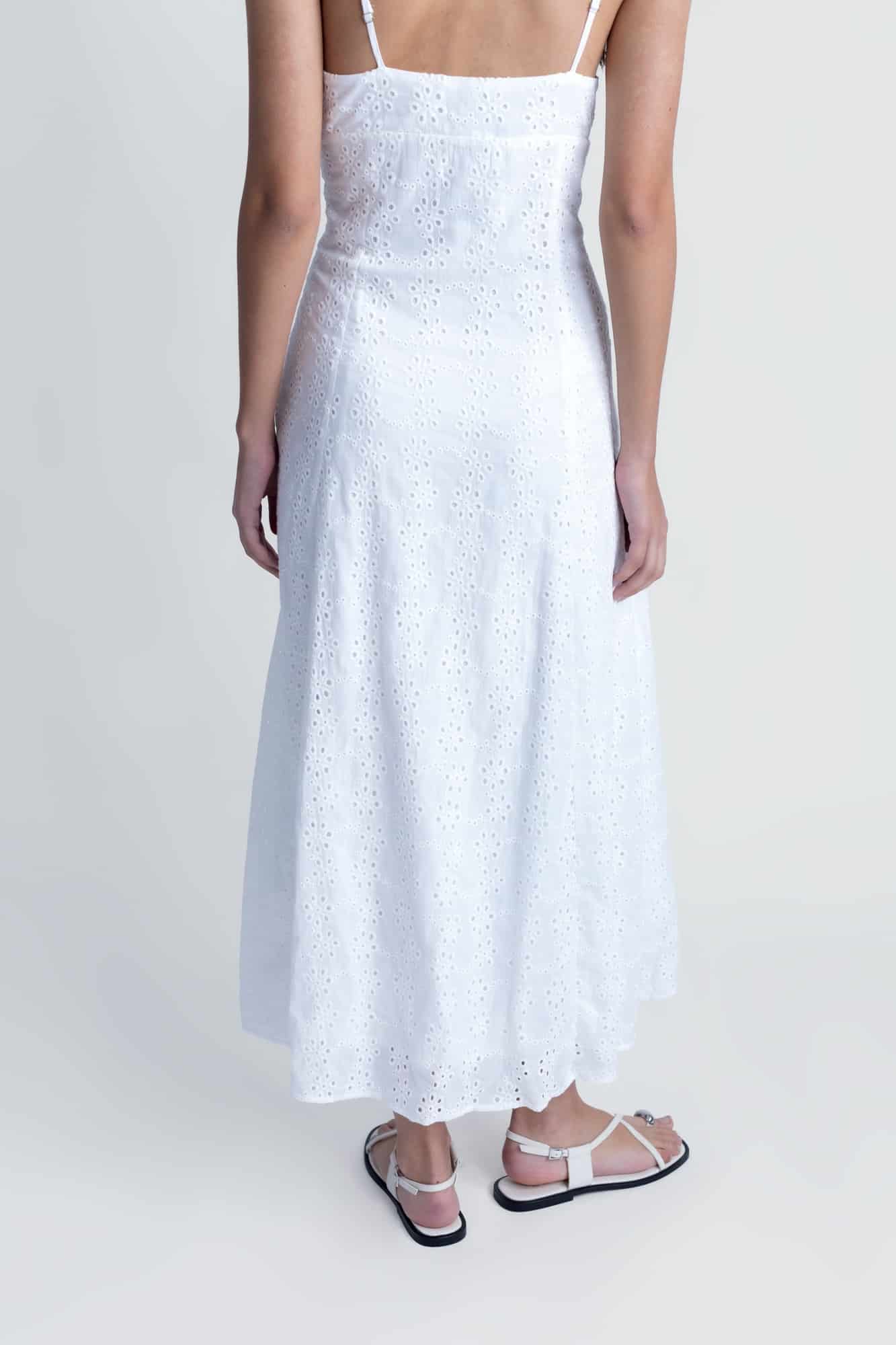 Romantique et délicate, succombez au charme cette robe longue en coton entièrement confectionnée en broderie anglaise. Bretelle fine avec un joli décolleté.