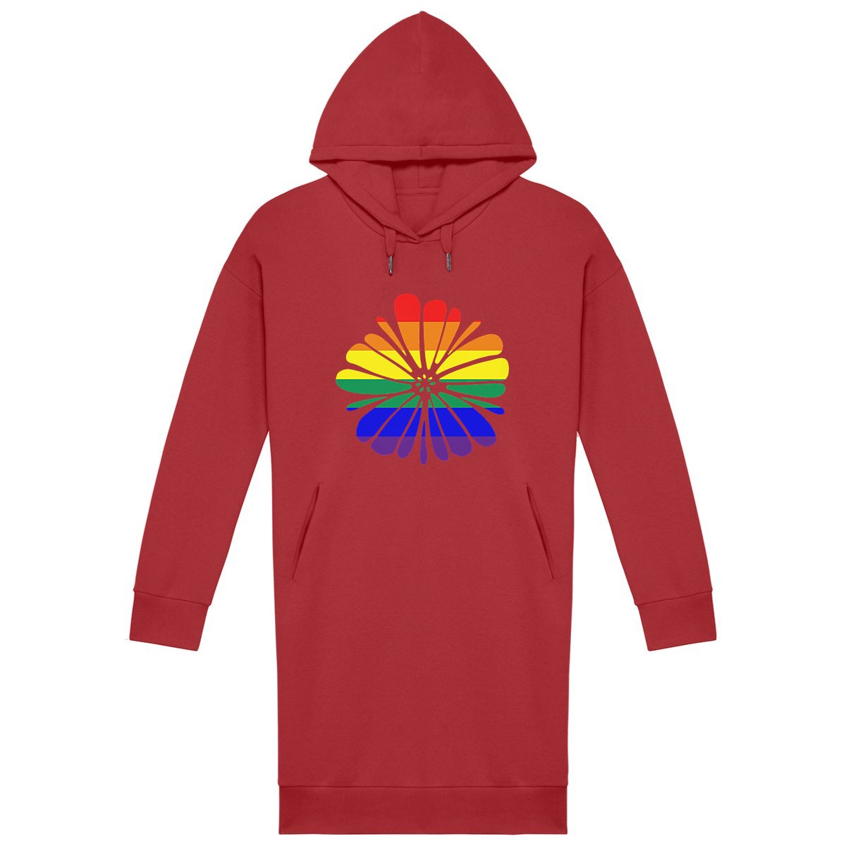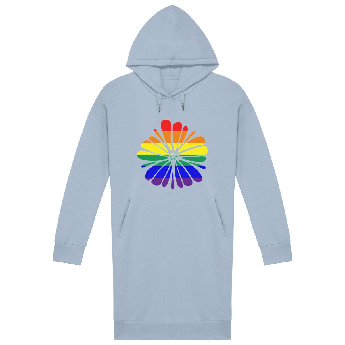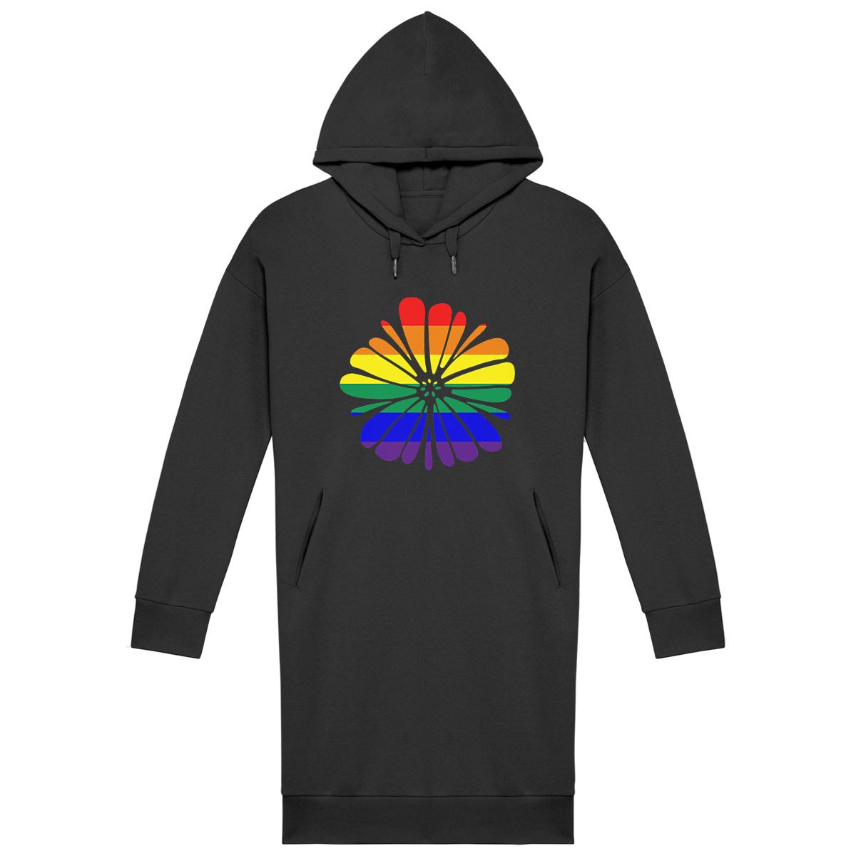 Robe sweat à capuche coupe moderne en coton biologique et polyester recyclé, motif fleur avec drapeau LGBT, pour un look engagé, confortable et écoresponsable au quotidien.
