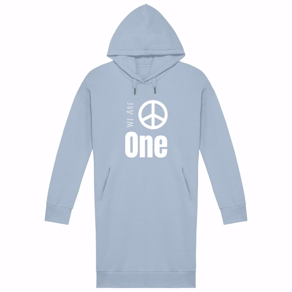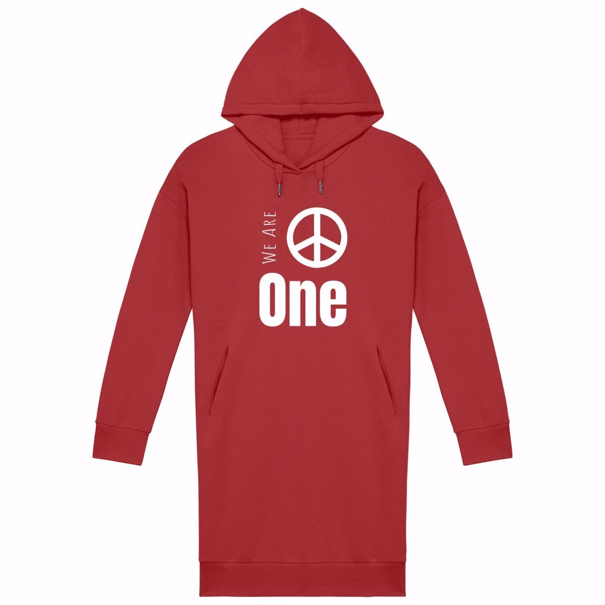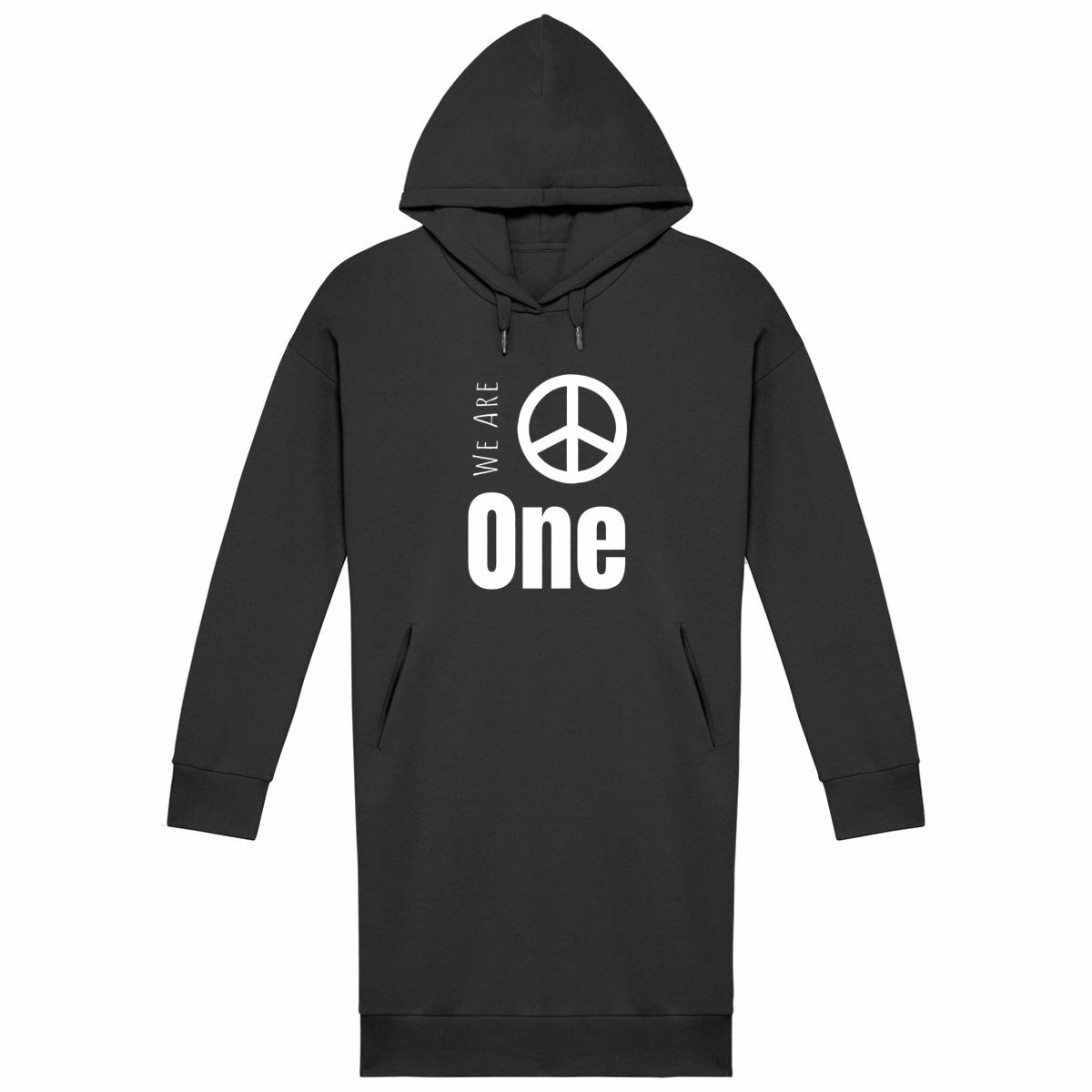 Robe sweat capuche femme 100% écoresponsable, en coton biologique et polyester recyclé, avec slogan We Are One et logo Peace and Love imprimé en France, pour un style streetwear engagé, doux et durable.