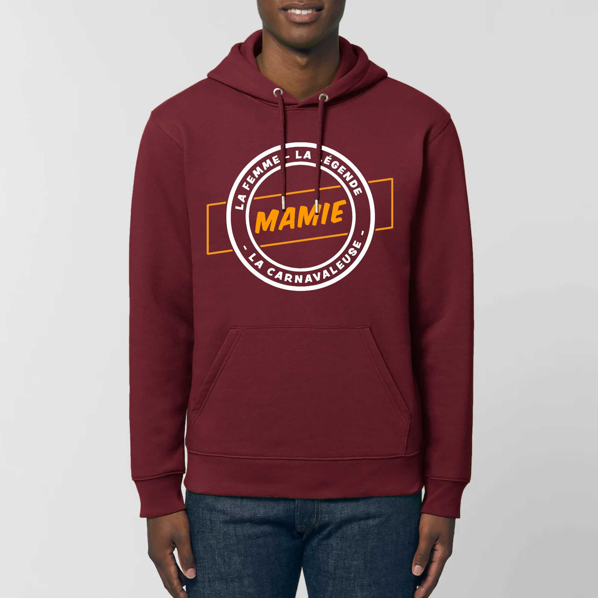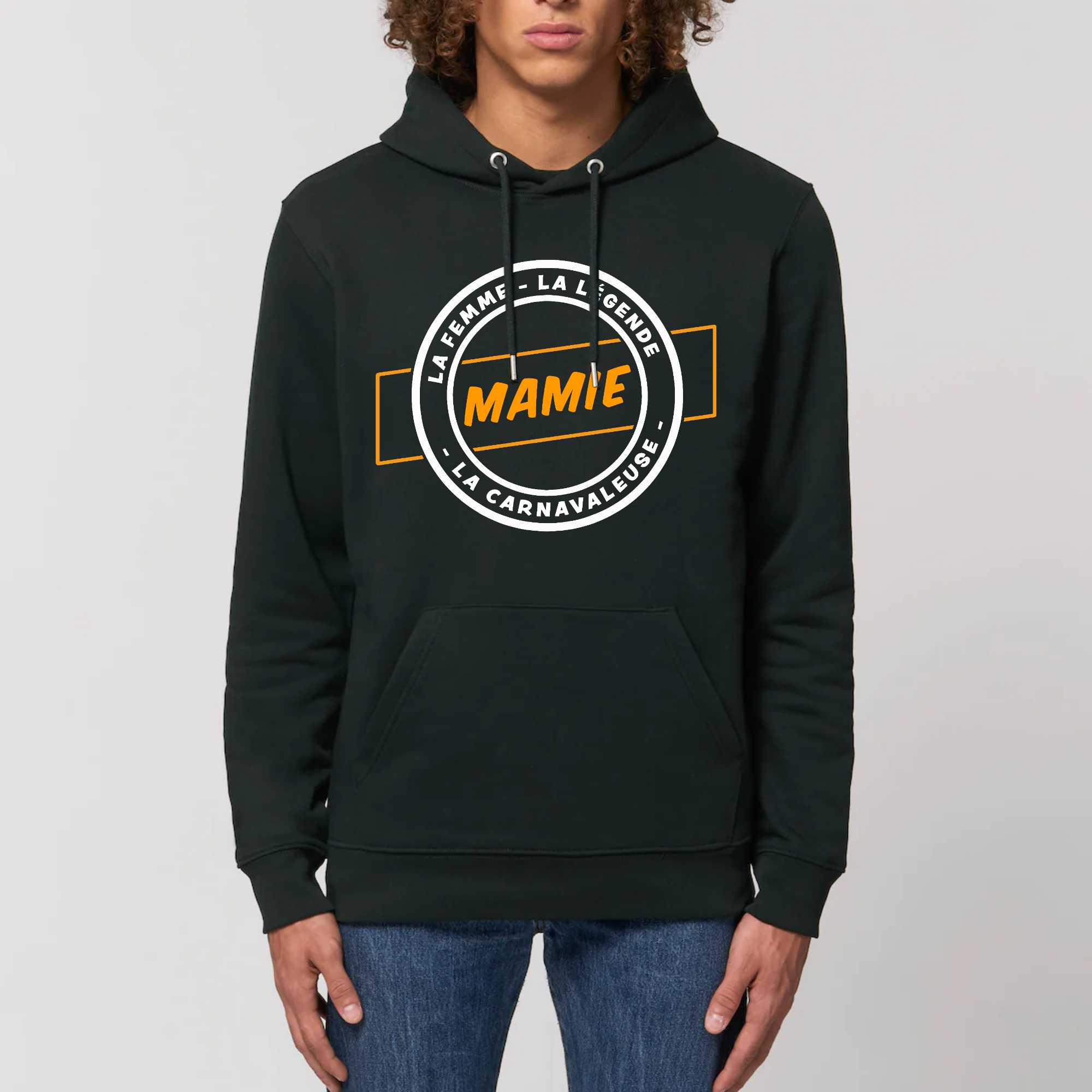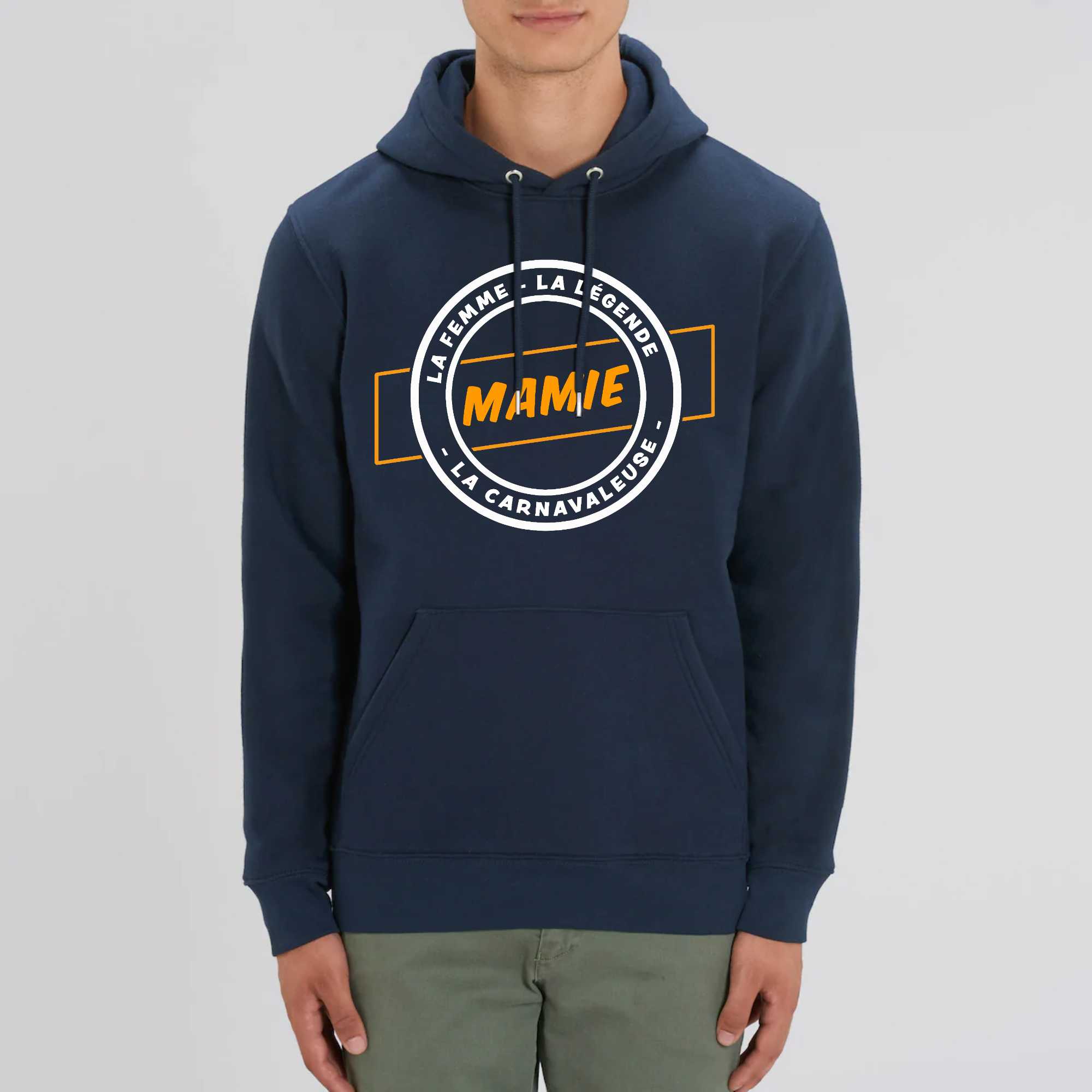 Notre Sweat à capuche avec poche ventrale « Mamie la femme la légende la carnavaleuse », un Sweat à capuche écoresponsable et résistant
