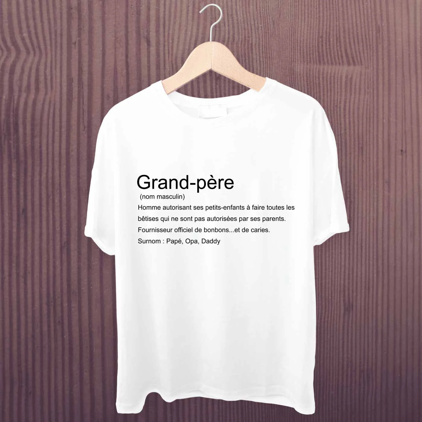Ce T-shirt « Définition Grand Père » fait partie de notre gamme de T-shirts spécialisés dans la thématique des grands-pères (et de l’humour bien évidemment). Votre papy s’est occupé de vous à de multiples reprises (surtout lorsque vos parents partent en vacances se dorer la pilule) ! Il vous laisse faire toutes les bêtises sans vous punir comme le faisaient vos parents. La belle époque où l’on pouvait manger un paquet de bonbons sans culpabiliser ni se faire réprimander ! Dès que vous voyez vos grands-parents, vous savez que vous allez vous régaler avec de bons petits plats. Également, à peine arrivé, vous recevrez beaucoup de petits cadeaux très simples, mais qui faisait plaisir ! Tous ces souvenirs d’enfance montrent à quel point la joie de vivre et la liberté étaient présentes chez les grands-parents ! Pour remercier votre papy de tous ces moments de joie, rien de tel que de lui offrir un cadeau (pour son anniversaire, Noël ou la Fête des Grands-Pères). Nous vous proposons un beau T-shirt humoristique reprenant une définition décalée des grands-pères. Ainsi, il sera fier comme un coq d’aller au marché avec ce fabuleux T-shirt !