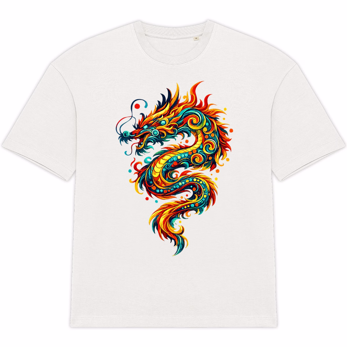 Affirme ton style avec ce T-shirt Dragon enflammé unisexe oversized en 100% coton biologique, épais 220 g/m², labellisé O.C.S et Eve VEGAN, pour un look streetwear écoresponsable puissant, durable et équitable.