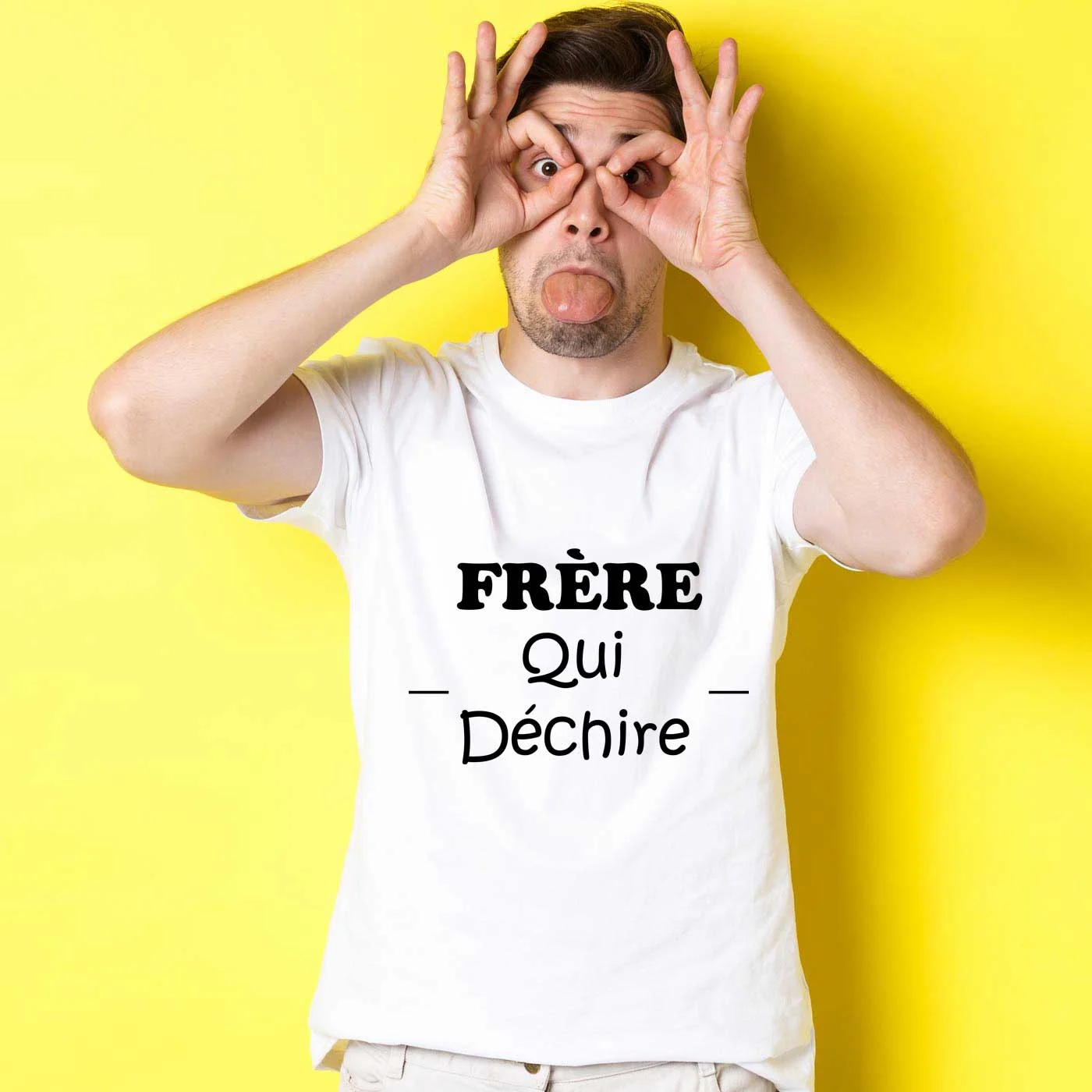 Ce T-shirt « Frère qui déchire » fait partie de notre gamme de T-shirts spécialisés dans la thématique des frères (et de l’humour bien évidemment). Pour celles et ceux qui ont des grands ou des petits frères, nous vous rendons hommage pour les avoir supportées. Arrêtons les boutades, un frère est une personne unique qui vous soutiendra durant toute votre existence. Place désormais au côté conflictuel que peut donner une relation frère-soeur ou entre frère. Vous vous êtes très certainement déjà chamailler (oui, ce mot existe). Ainsi, vous aimez donc vous taquiner pour lui montrer que vous l’aimez malgré tout cela. Vous êtes à la recherche d’un cadeau pour votre frère (anniversaire, Noël par exemple) ? Vous êtes au bon endroit pour lui offrir un cadeau qui le fera rire, sous condition qu’il ait de l’humour ! Ce beau T-shirt humoristique mettra en valeur un frère qui a besoin de se sentir valorisé. Avec un tel T-shirt, soyez certains que vous pourrez désormais lui demander tout ce que vous voulez. Plutôt malin, non ?